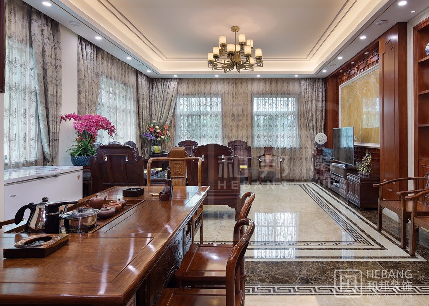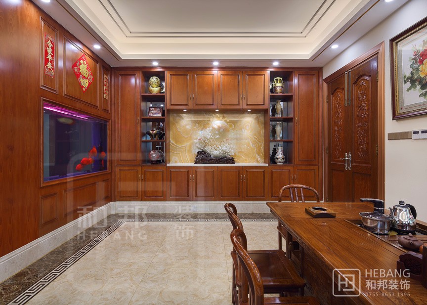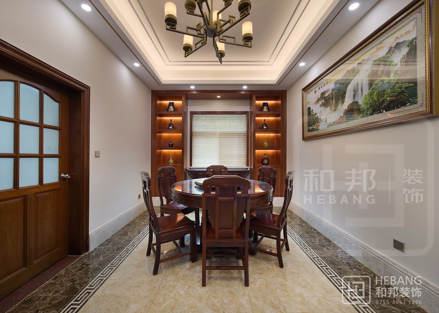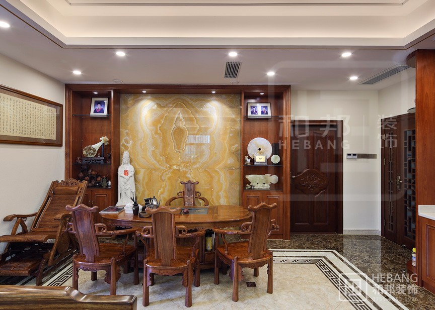 空間內(nèi)大量運用的木飾面、藤條、石材等天然裝飾材料,以及配合使用的棉麻質(zhì)地等極具自然情趣的家具在設(shè)計師的巧妙運用下打造出了一個靜謐雅致,深富中式的家居空間。