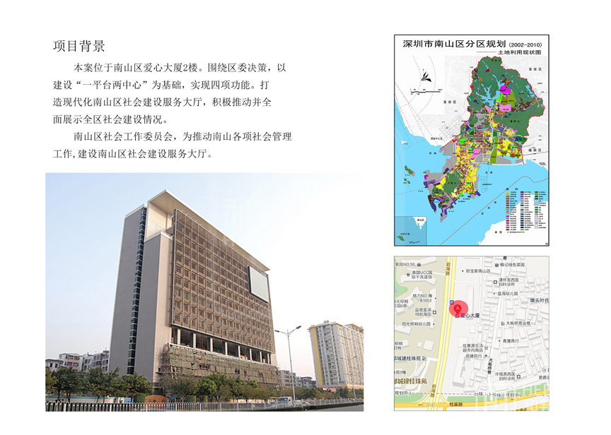 設(shè)計說明 | 本案位于南山區(qū)愛心大廈2樓。圍繞區(qū)委決策,以建設(shè)“一平臺兩中心”為基礎(chǔ),實現(xiàn)四項功能。打造現(xiàn)代化南山區(qū)社會建設(shè)服務大廳,積極推動并全面展示全區(qū)社會建設(shè)情況。 |