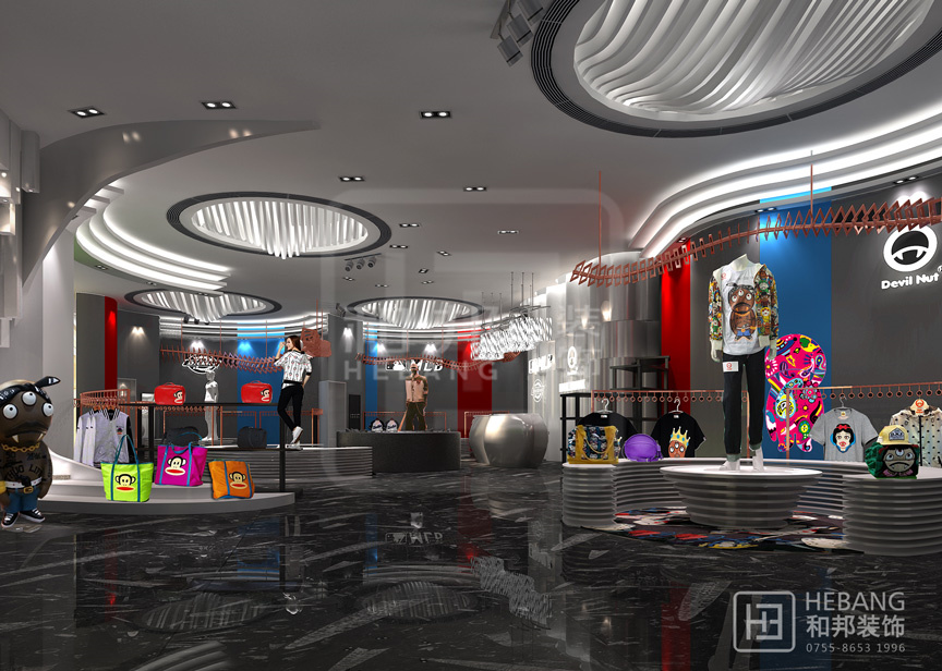 設(shè)計(jì)說明 | 極具現(xiàn)代風(fēng)格,豐富的色彩運(yùn)用以及富有童趣的設(shè)計(jì)元素使整個(gè)賣場氛圍輕松、明快。創(chuàng)意十足的天花設(shè)計(jì)以及吸引眼球的墻面裝飾更能吸引消費(fèi)者眼球。 |