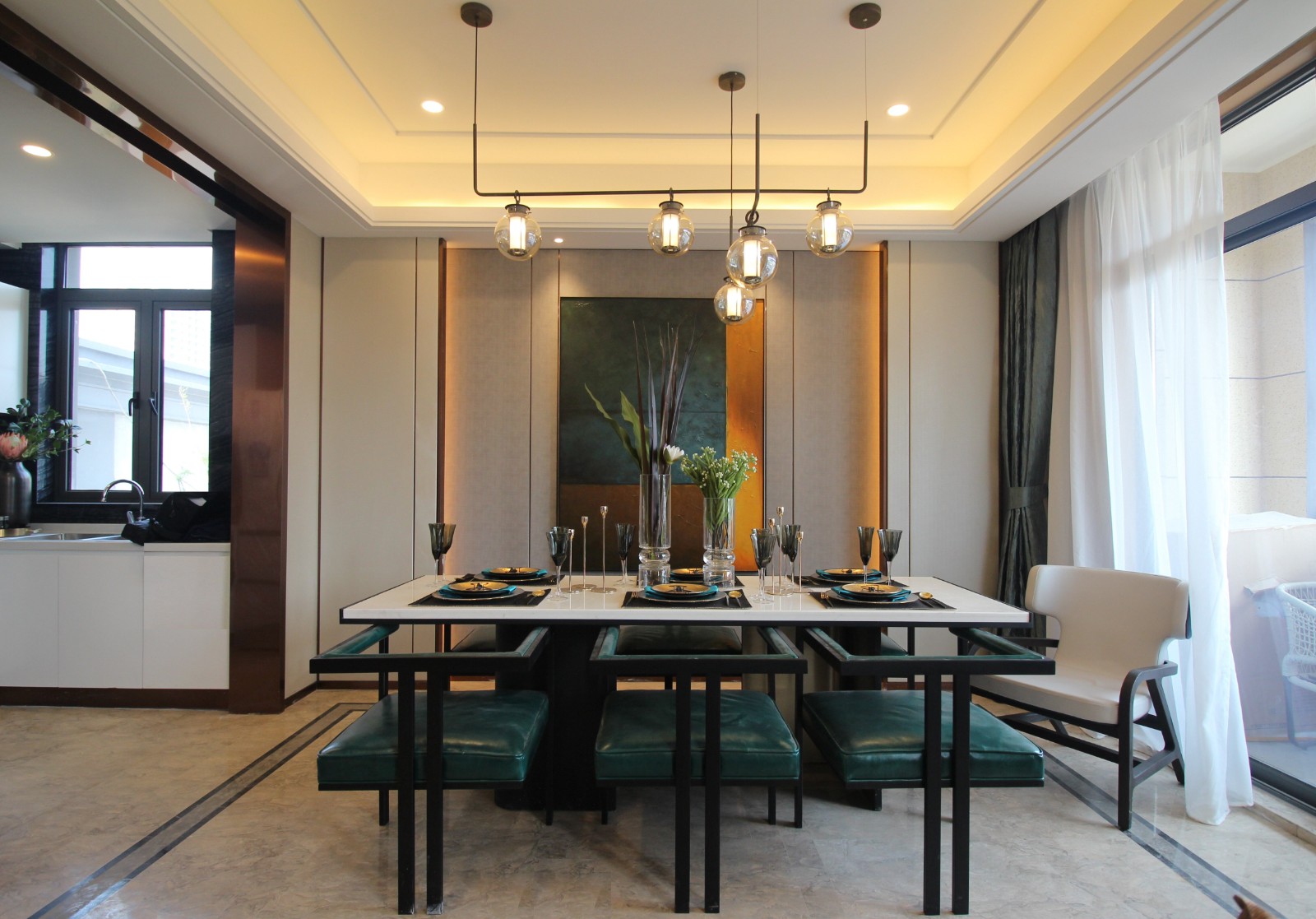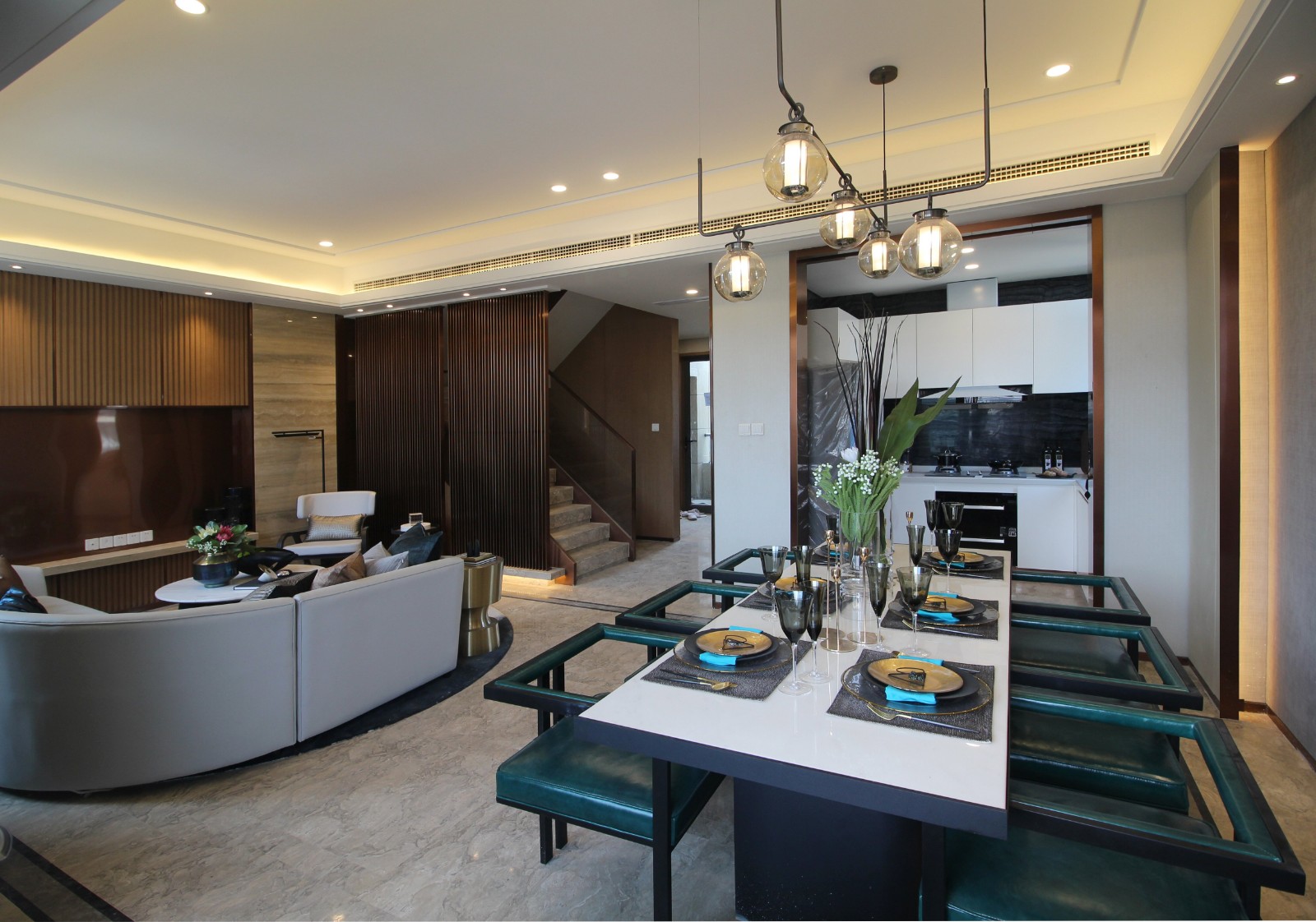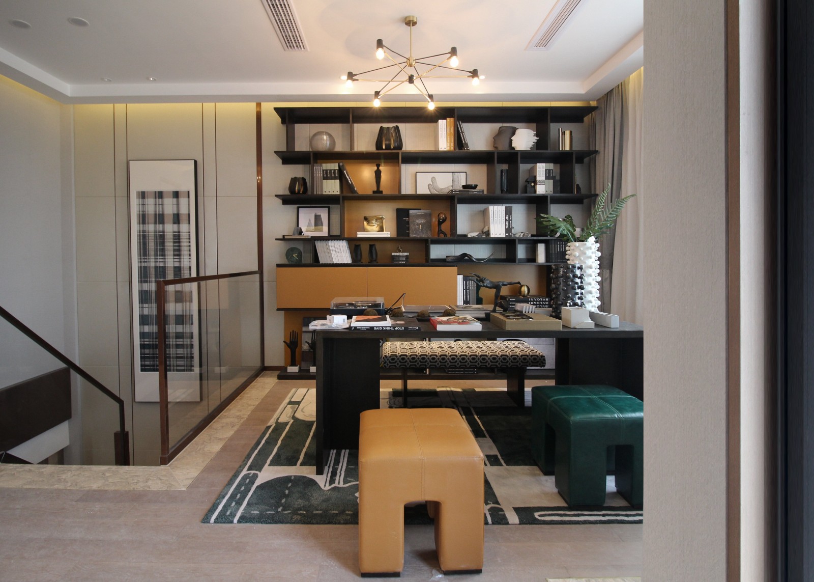 一層承載了家庭起居的基本功能,在從門廳進(jìn)入客廳的縱向性布局基礎(chǔ)上,以地毯線條和吊燈裝置陣列分布相呼應(yīng),從視覺上,形成了客餐廳的延伸感。餐廳中加入藝術(shù)家的作品,提升整個空間的藝術(shù)性和當(dāng)下時代精神??筒蛷d保持傳統(tǒng)的陳設(shè)布局方式,飾品的擺放相對規(guī)整,看似穩(wěn)定的布局,卻有著空間的自由度和個性。