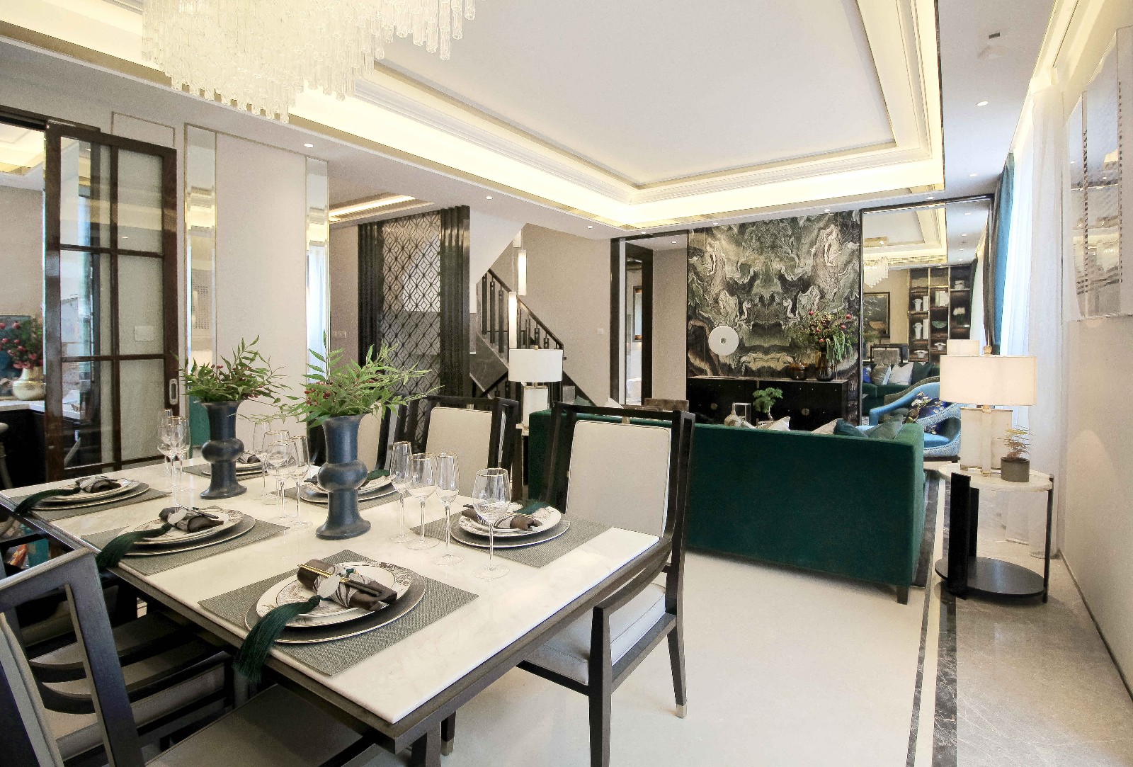 一層空間,讓我們進(jìn)入到了“隔而不離”的敞朗的客餐廳區(qū)域。簡(jiǎn)潔的米色作底,夾雜著立體而溫潤(rùn)的木色,梳理出了柔和而婉約的空間氣質(zhì)。餐廳一側(cè),我們通過(guò)加擴(kuò)原空間陽(yáng)臺(tái)的位置,最大限度地納入室外的自然之景,與客廳區(qū)一并形成了雙面采光觀景的空間效果。光在空間中遷移流轉(zhuǎn),那些與人聯(lián)系密切的物品也逐漸顯露出各自的色彩、層次,和肌理,人在其中生活,只覺(jué)是生活在自然與柔軟的日常里。