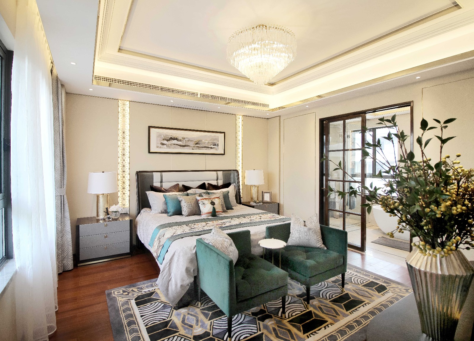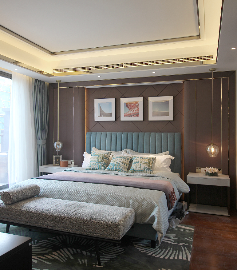 通過(guò)色彩的節(jié)奏變化,年輕感而又具有品質(zhì)的主臥空間被呈現(xiàn)了出來(lái)。主臥空間內(nèi)嵌獨(dú)立衣帽間及衛(wèi)浴空間,提升了主人對(duì)于生活品質(zhì)的追求。在吊頂?shù)瓤臻g多處,柔和的圓角造型代替了棱角的尖銳,一抹金調(diào)的點(diǎn)綴、一撇綠植的協(xié)調(diào),梳理出了偏女性化的空間之美。