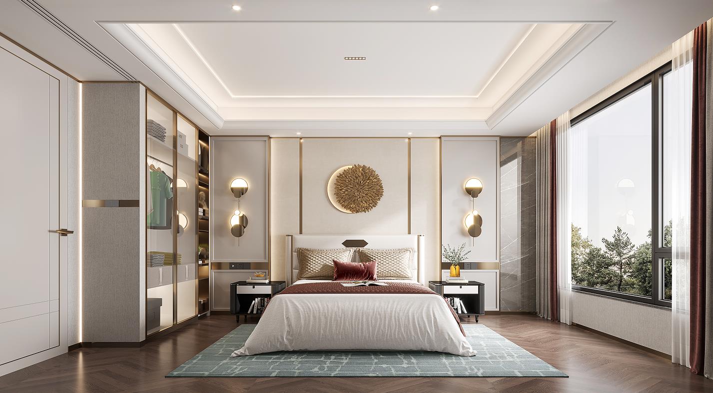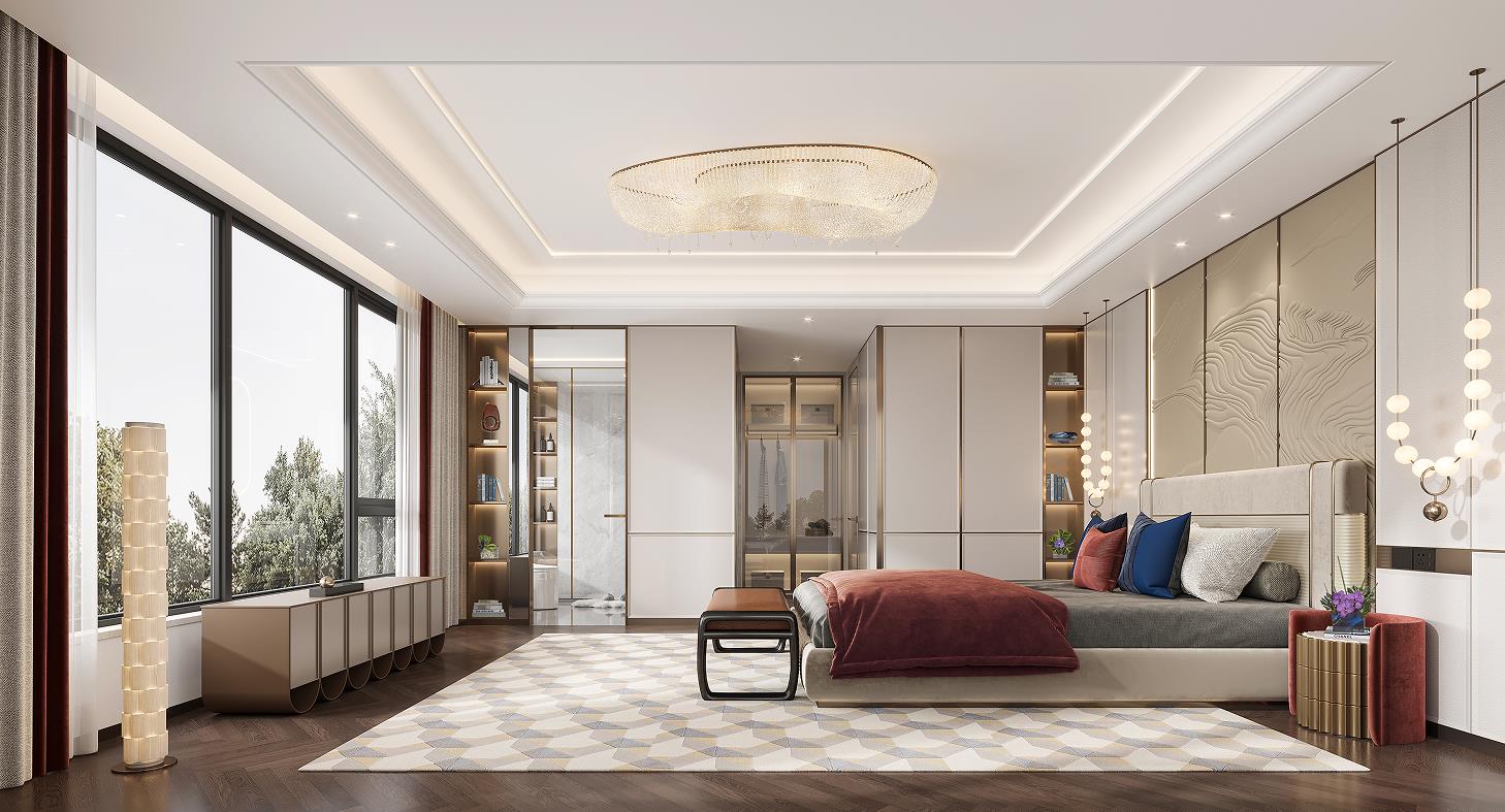 二層主臥入戶門采用了雙開門入戶形式,配備了功能完備,且尺度寬闊的全定制衣帽間及獨立衛(wèi)浴室。淺藍色極具包裹感的床,愜意而溫暖,獨特的選型成為主臥的視覺亮點,展現(xiàn)著主人時尚大氣的品味特質(zhì)。