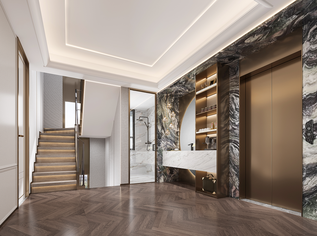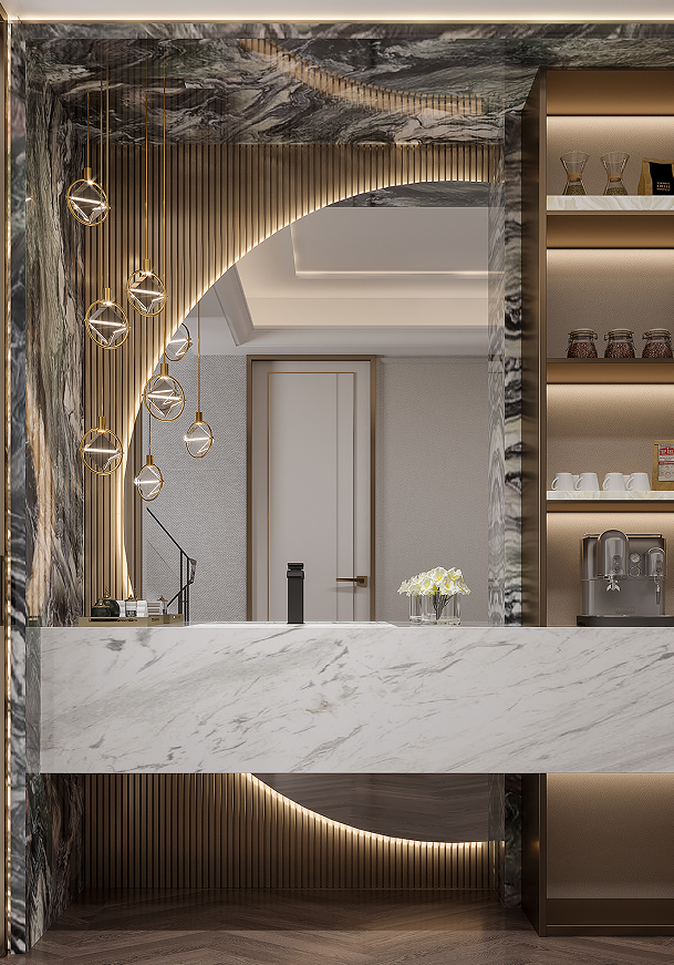上疊一層多功能家庭活動室滿足聚會、觀影、沙龍等多樣化生活場景,紋理天然的背景奢石、鏡面水紋不銹鋼,幻化成熠熠生輝的發(fā)光源在空間中閃耀,為聚會增添了更為閃亮的氛圍。